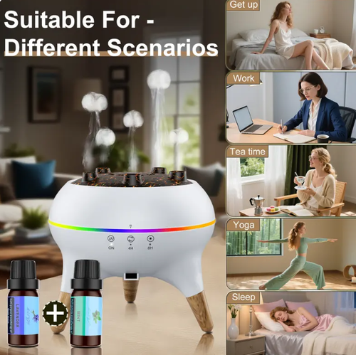 Flame & Mist-Ring Aromatherapy Humidifier — Wood-Grain Essential Oil Diffuser with Dynamic Jellyfish-Effect LED Lighting