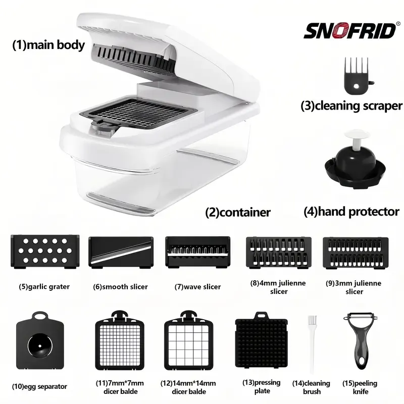 Snofrid Vegetable Chopper,15-in-1 Multifunctional Food Chopper,Professional Onion Chopper with 8 Blades,Vegetable Cutter with Container for Salad,Potato,Carrot,and Garlic, Essential Kitchen Tool